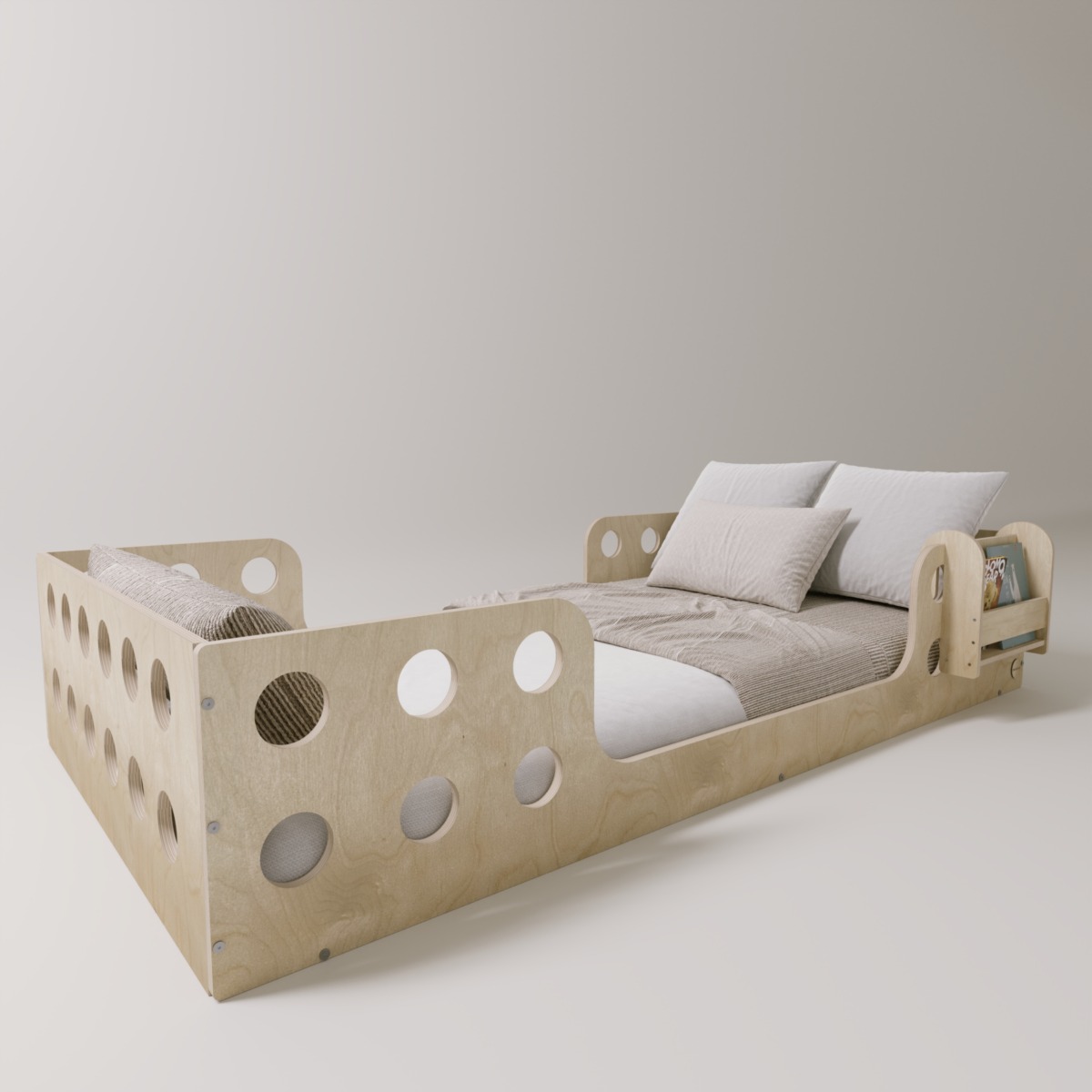 Das Bett bietet eine sichere, bodennahe Schlafumgebung, die die Selbstständigkeit stärkt