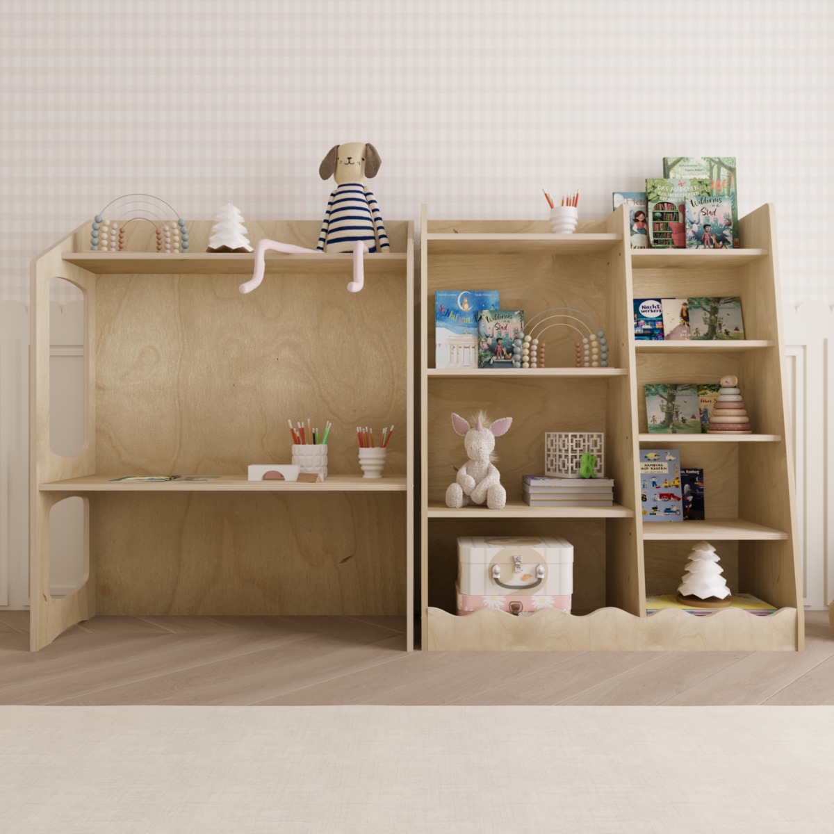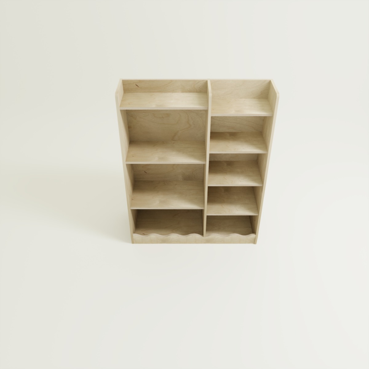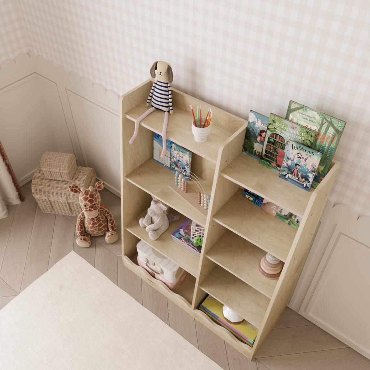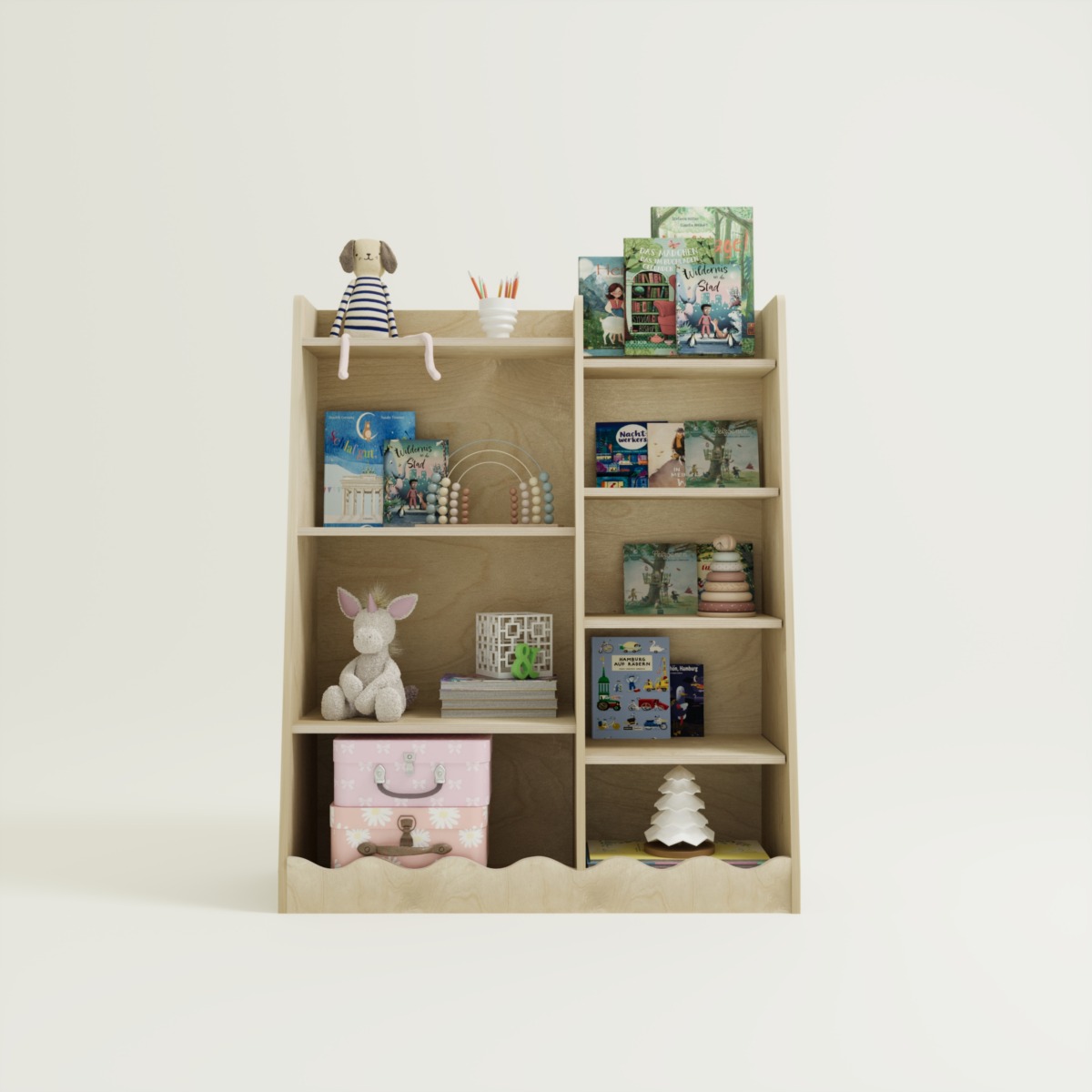 Das Montessori Bücherregal Wave unterstützt die Selbstständigkeit Ihres Kindes durch ein offenes und leicht zugängliches Design. Spielzeuge, Bücher und Bastelutensilien finden in den unterschiedlich großen Fächern ihren festen Platz und sind für kleine Hände jederzeit erreichbar.