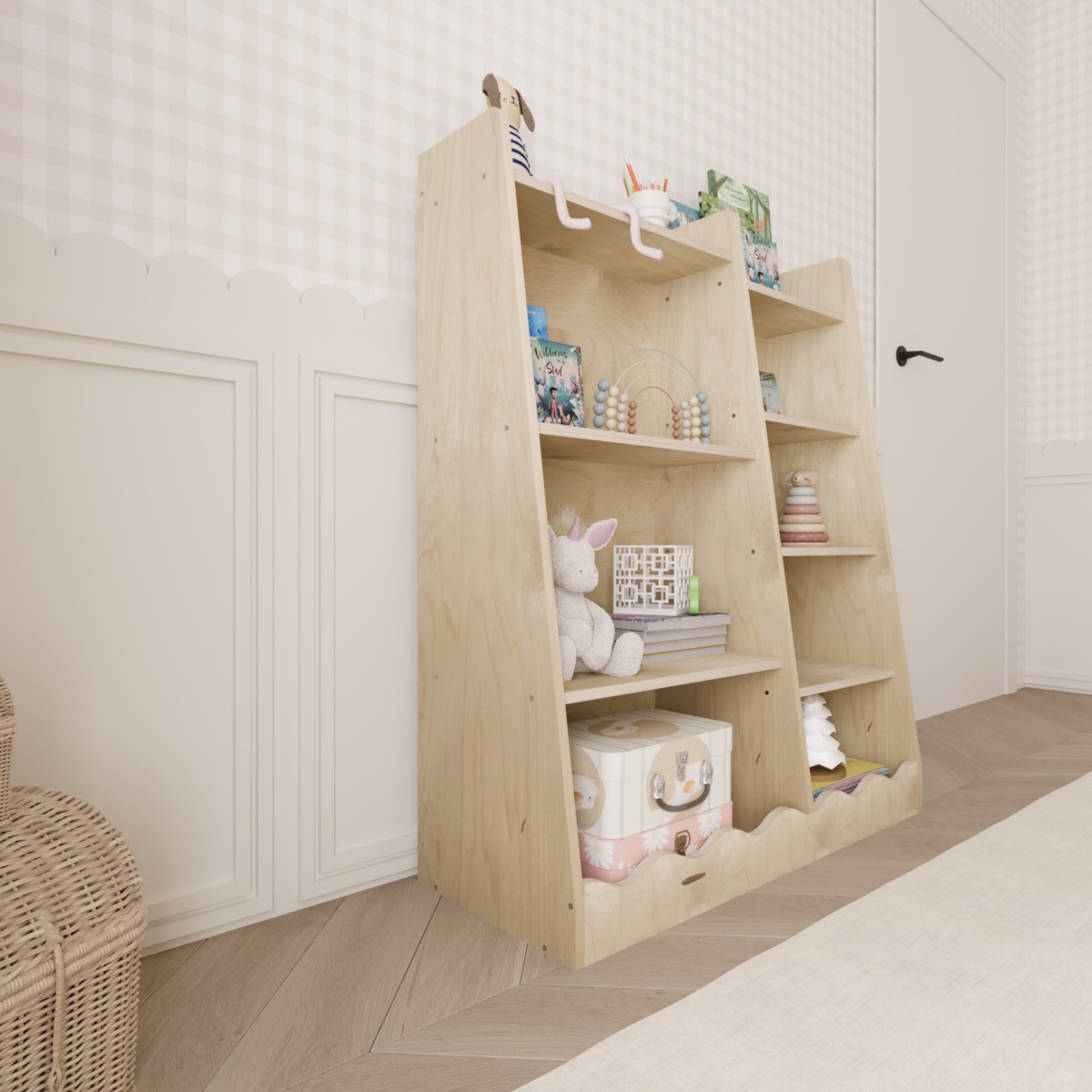 Gefertigt aus robustem Birken-Sperrholz überzeugt das Regal durch seine Stabilität und Langlebigkeit. Die natürliche Holzmaserung sorgt für eine warme Atmosphäre im Kinderzimmer, während die glatt geschliffene Oberfläche für eine angenehme Haptik und Sicherheit beim Spielen sorgt. Ein besonderer Blickfang ist die geschwungene Bodenleiste im Wellen-Design, die dem Möbelstück eine verspielte Note verleiht.