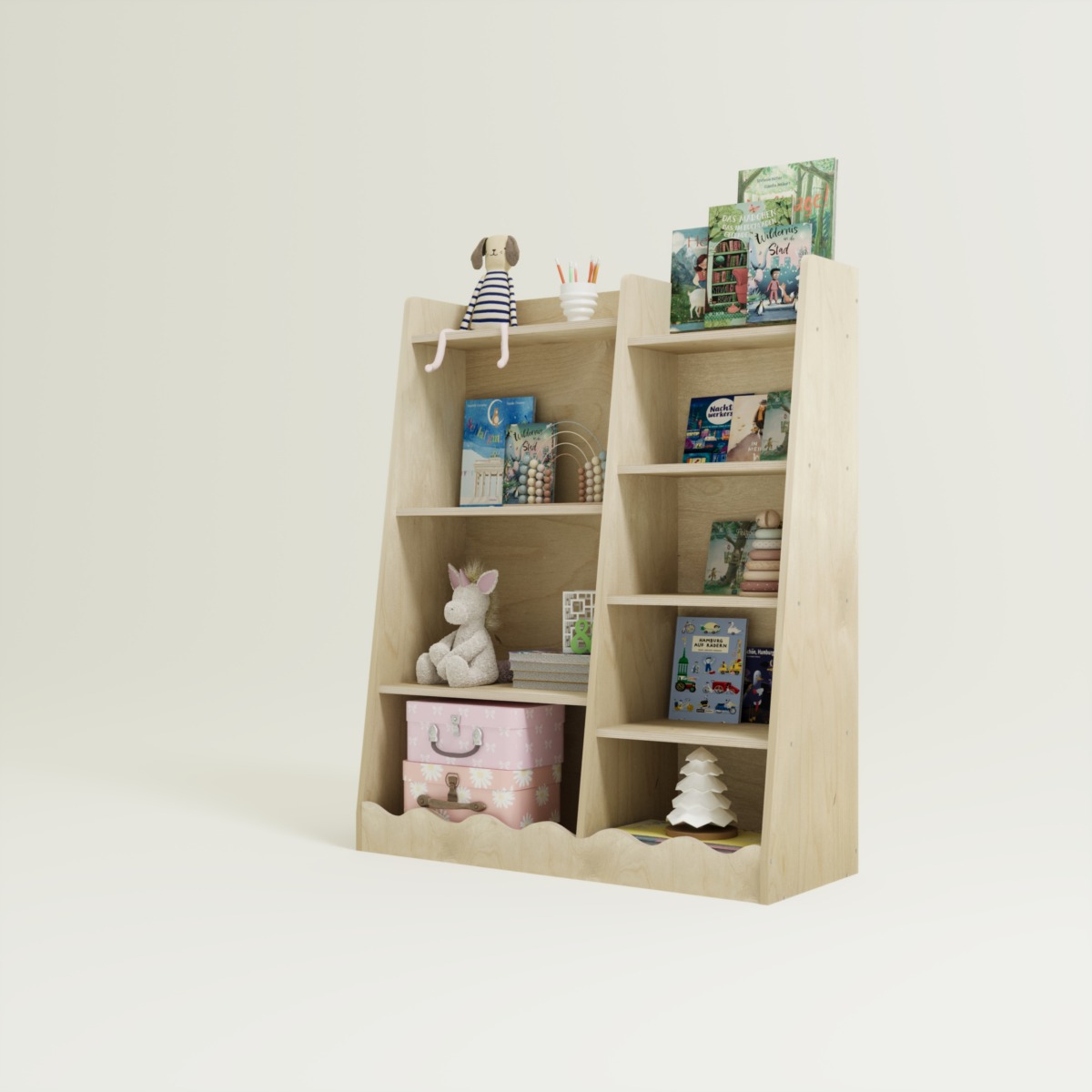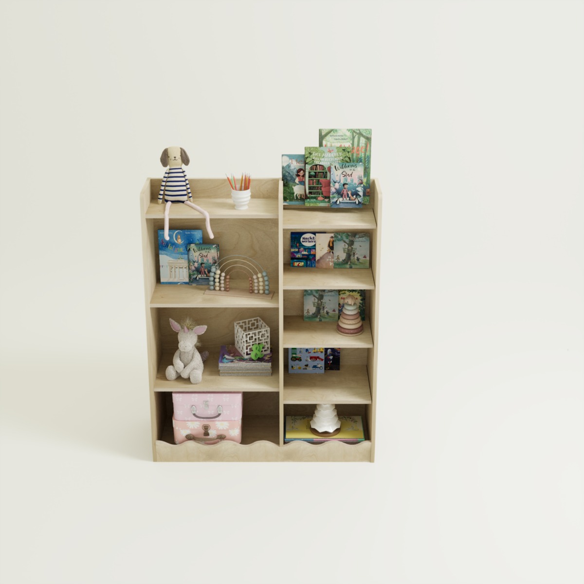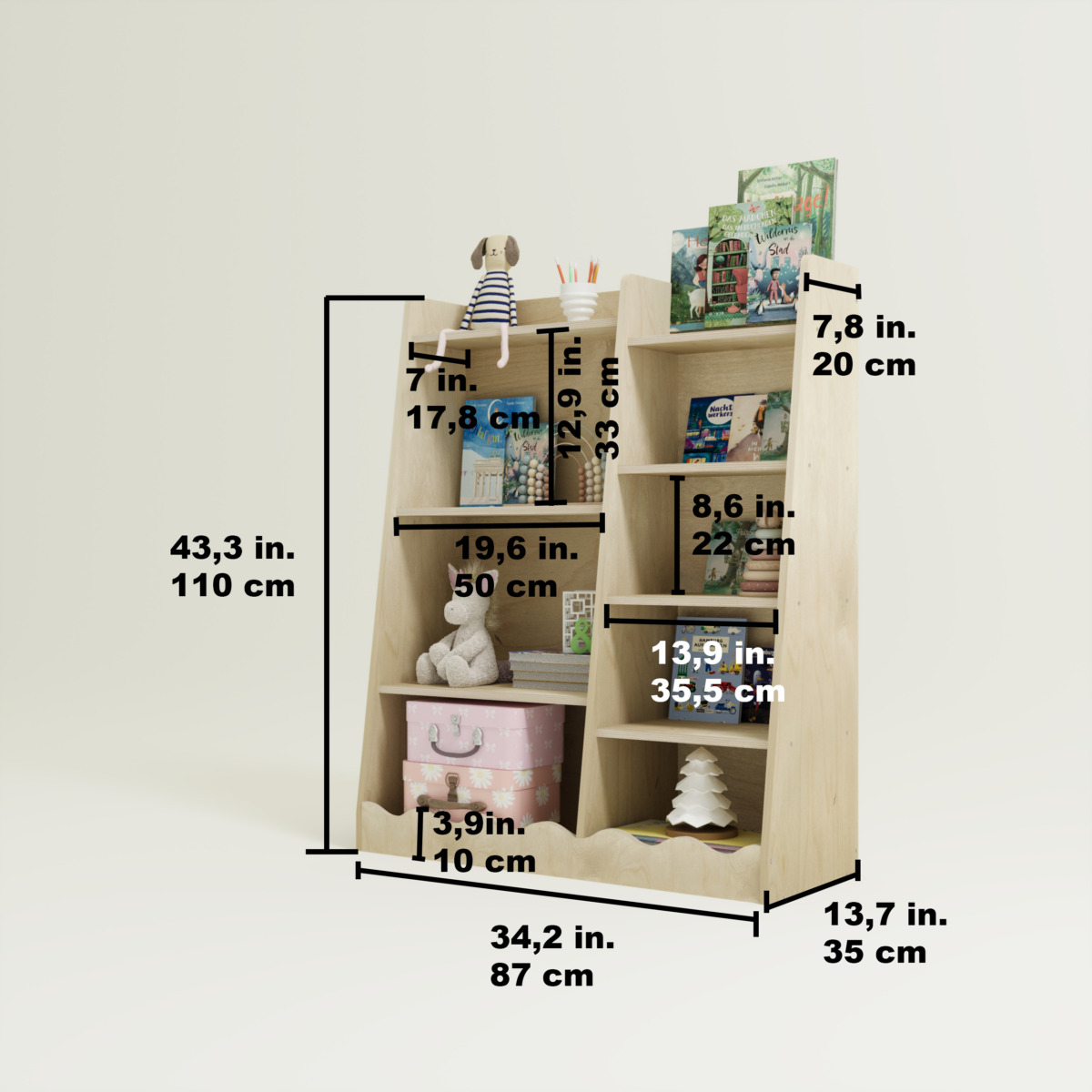 Die asymmetrische Aufteilung der Fächer ermöglicht es, sowohl große Bilderbücher als auch kleinere Spielzeugfiguren oder Aufbewahrungsboxen übersichtlich zu ordnen.