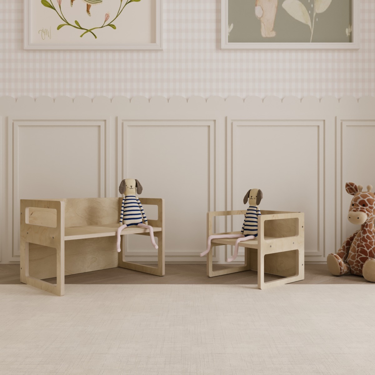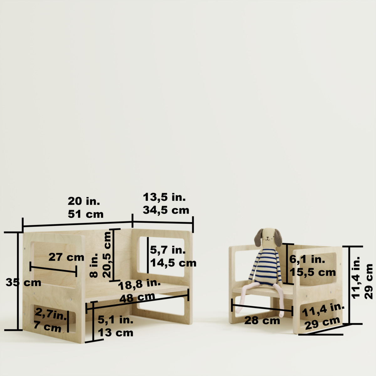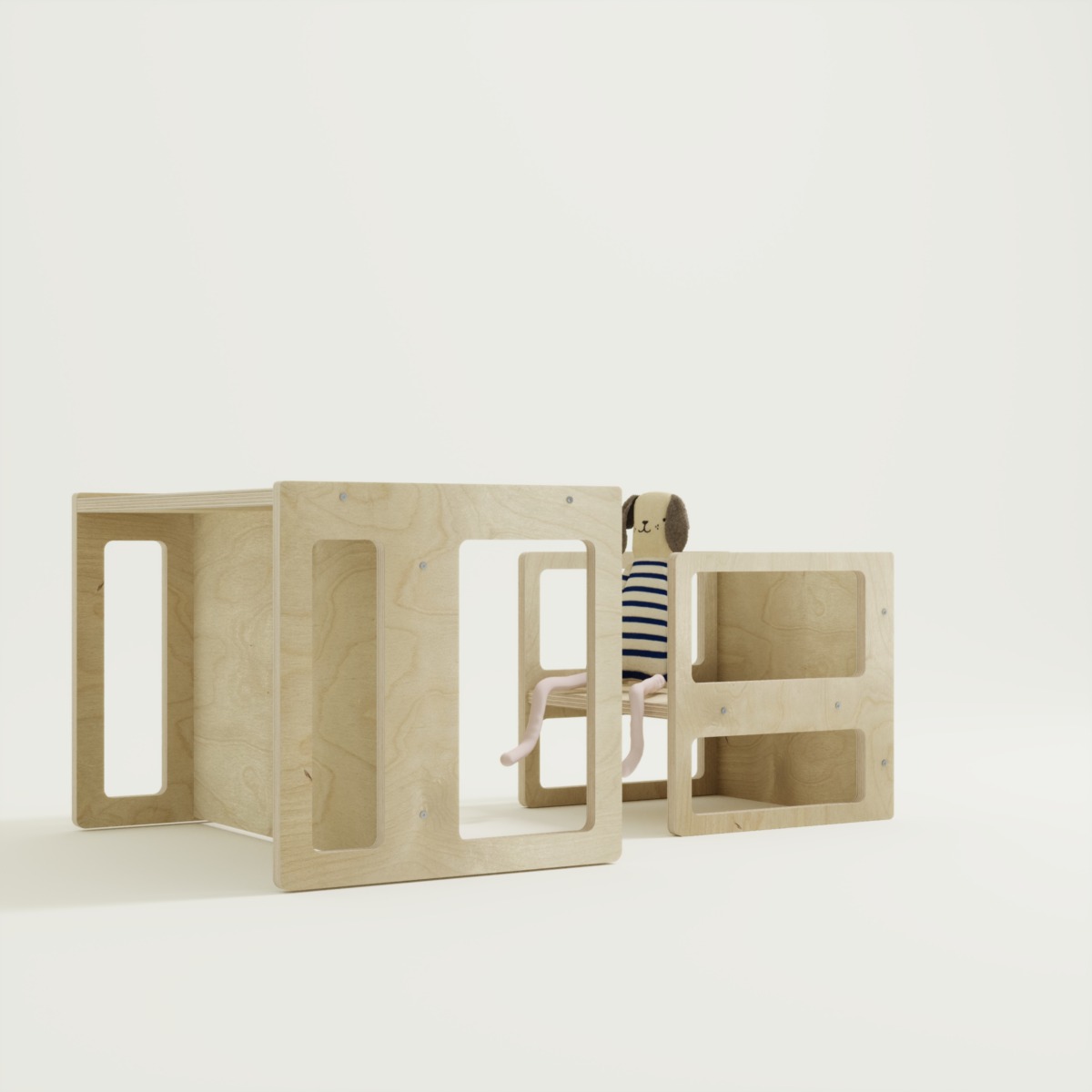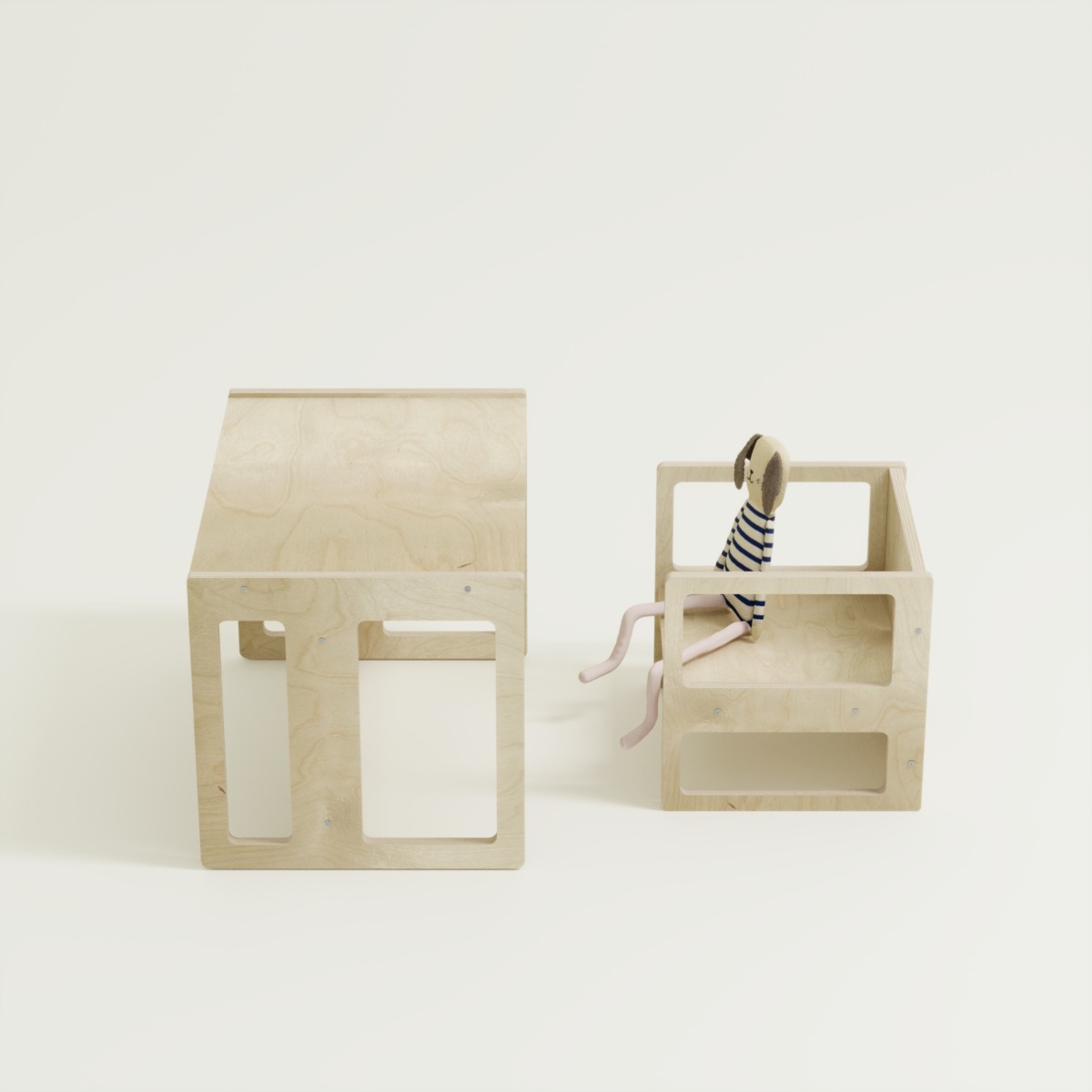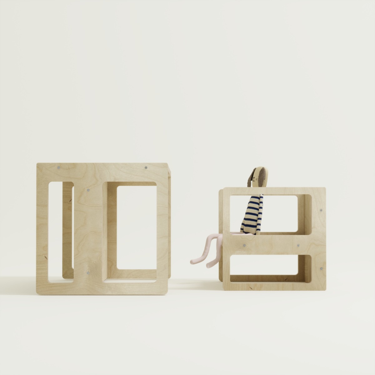 - Multifunktional: Die Möbelstücke können gewendet werden, um unterschiedliche Sitzhöhen oder Funktionen (Tisch, Bank oder Stuhl) zu erfüllen.