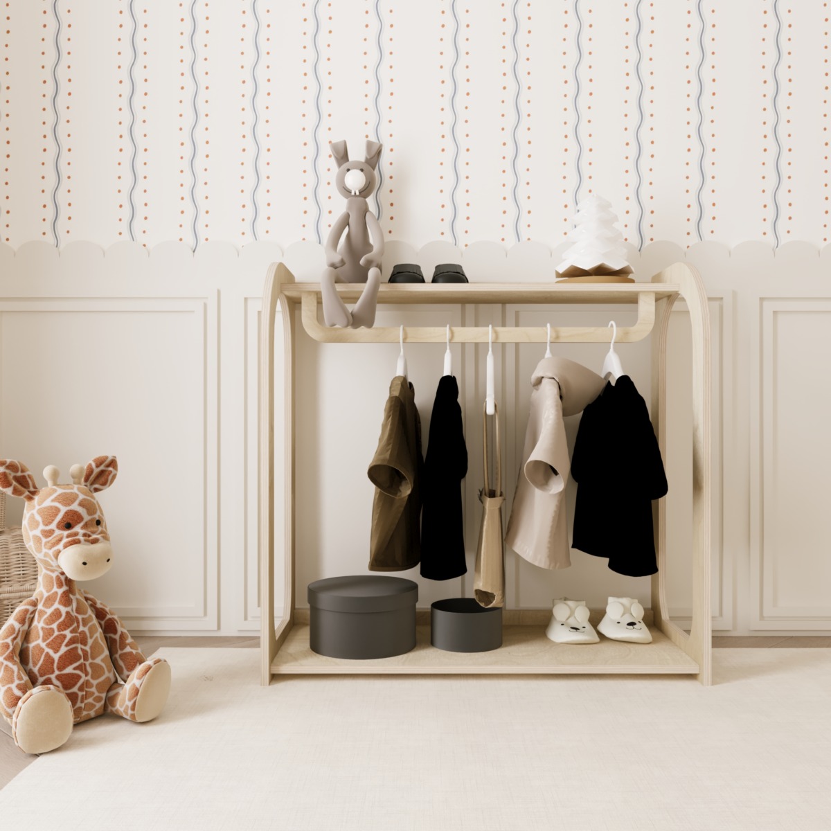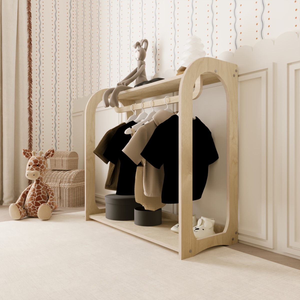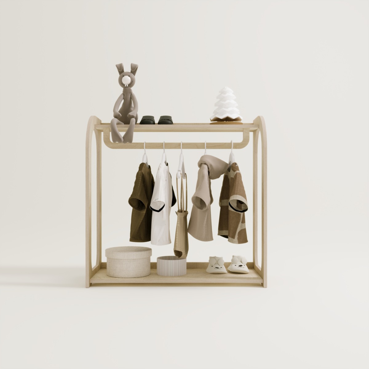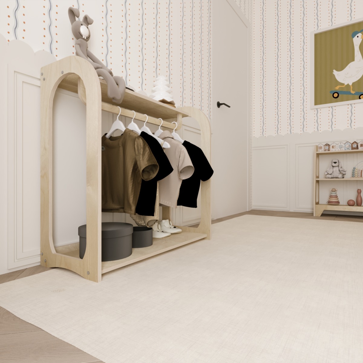 Der Montessori Kleiderschrank Arco ist ein offenes Schranksystem, das speziell für Kinder entwickelt wurde. Durch die niedrige Bauweise ermöglicht er es Ihrem Kind, Kleidung selbstständig auszuwählen, aufzuhängen und ordentlich zu verstauen. Dieses Möbelstück unterstützt die Unabhängigkeit und fördert die motorischen Fähigkeiten im Alltag.
