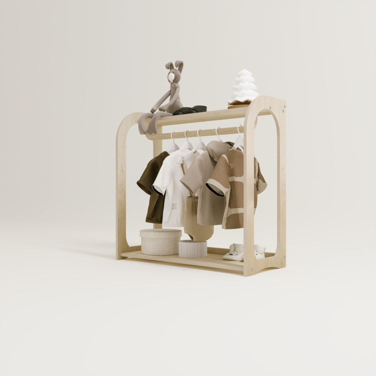 Gefertigt aus hochwertigem Birkensperrholz, bietet dieser Kleiderschrank eine robuste und langlebige Struktur. Die Oberfläche ist glatt geschliffen und vollkommen (glatt), was für eine sichere Handhabung im Kinderzimmer sorgt. Die natürliche Holzoptik passt perfekt zu verschiedenen Einrichtungsstilen und schafft eine freundliche Umgebung.