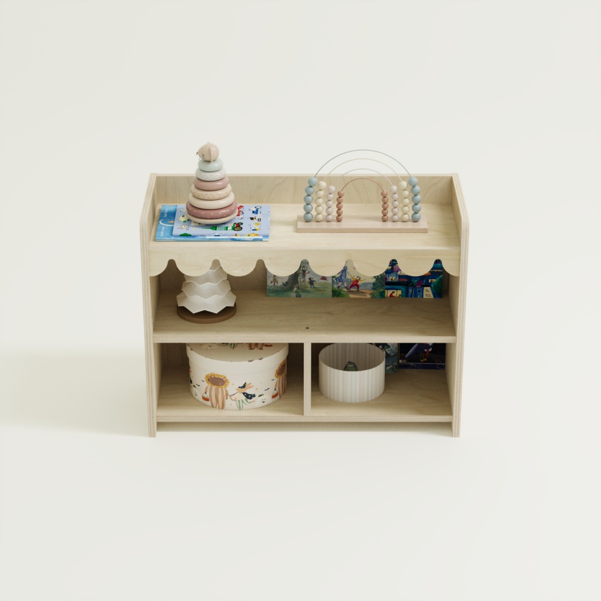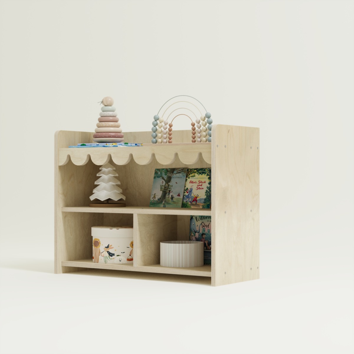 Das Montessori Spielzeugregal Ondina 3 ist die ideale Lösung für kleine Kinderzimmer oder Spielecken. Durch die niedrige Bauweise und die offene Struktur ermöglicht es Ihrem Kind, Spielzeuge und Bücher eigenständig auszuwählen und wieder aufzuräumen. Das verspielte Wellendesign an der Vorderkante sorgt für eine freundliche Optik, die perfekt in jedes moderne Kinderzimmer passt.