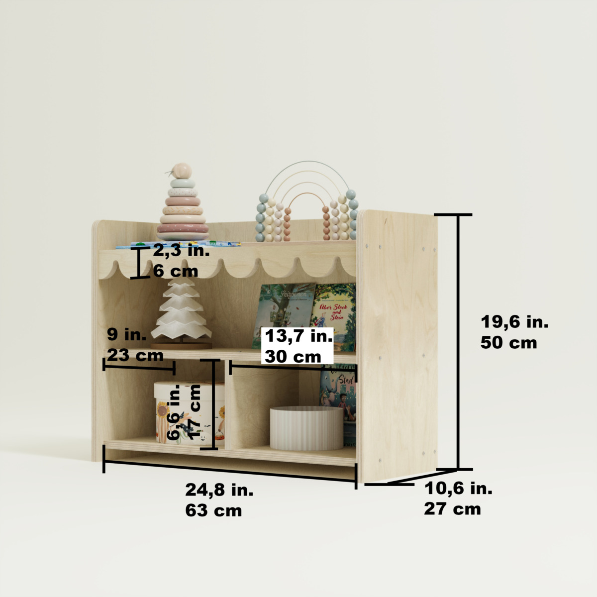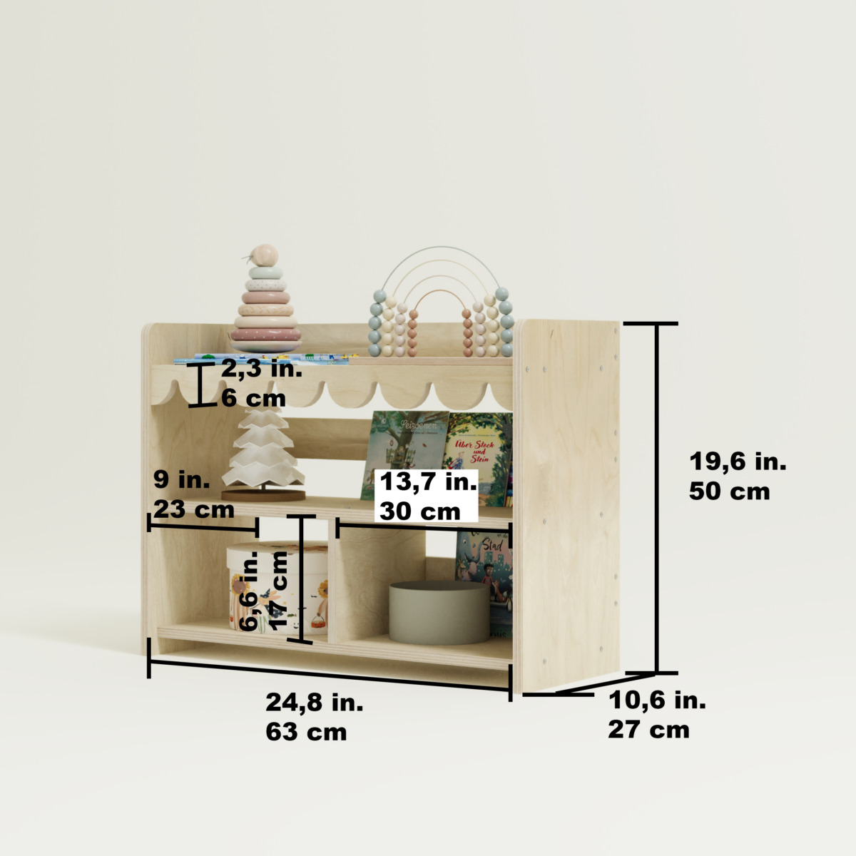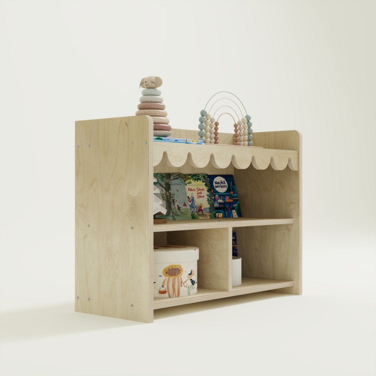 Our Montessori Spielzeugregal – Ondina 2 is expertly crafted from high-quality Birkensperrholz and crafted with intensive handwork. If no customizations are requested, it will be shipped within 5 business days.