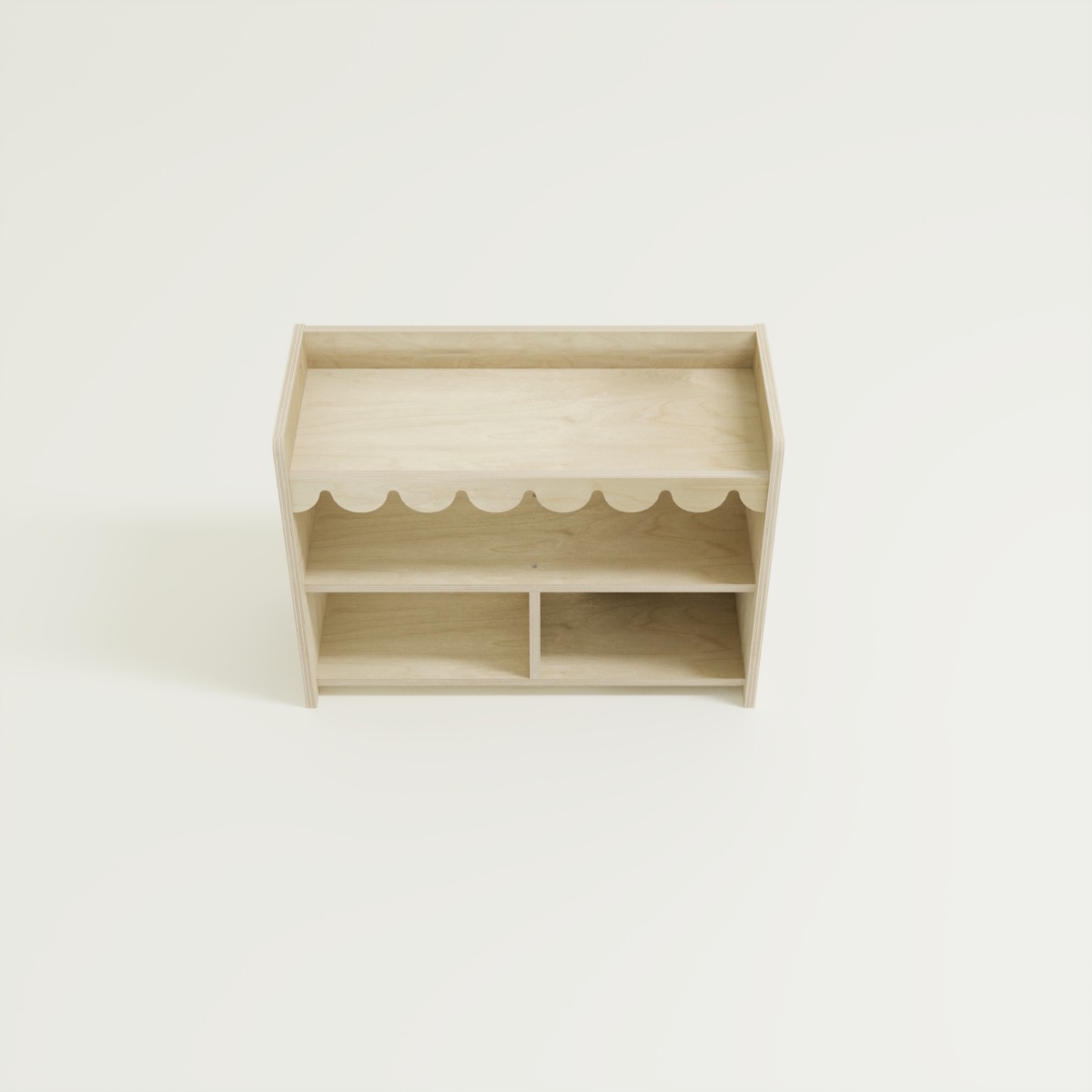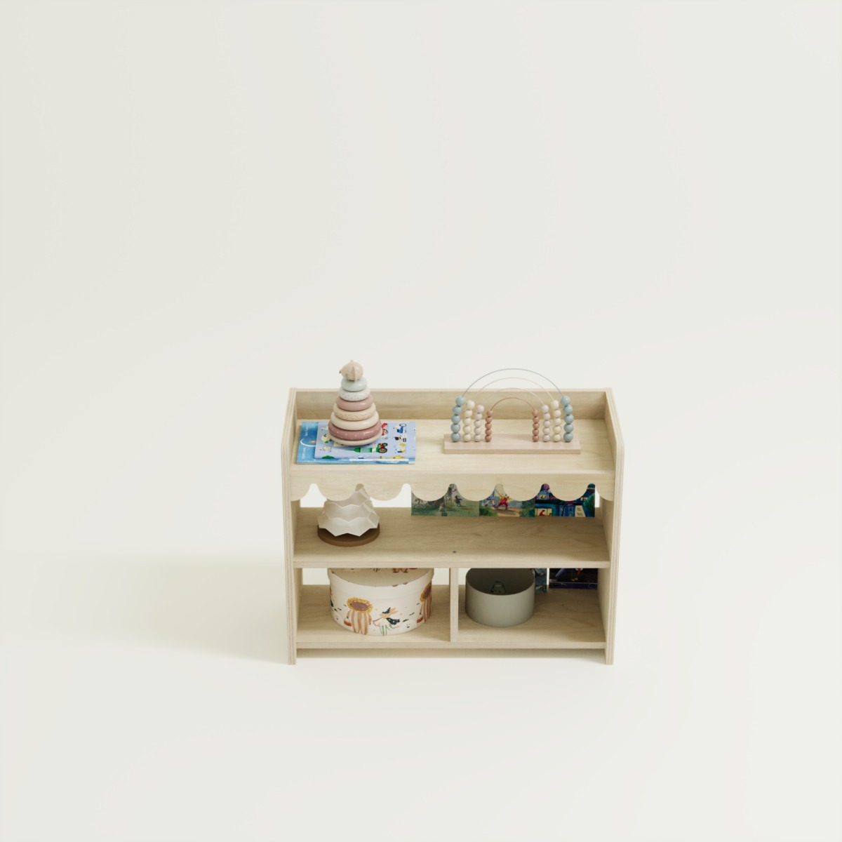 Das Montessori Spielzeugregal Ondina 2 ist die ideale Lösung für kleine Kinderzimmer oder Spielecken. Durch die niedrige Bauweise und die offene Struktur ermöglicht es Ihrem Kind, Spielzeuge und Bücher eigenständig auszuwählen und wieder aufzuräumen. Das verspielte Wellendesign an der Vorderkante sorgt für eine freundliche Optik, die perfekt in jedes moderne Kinderzimmer passt.