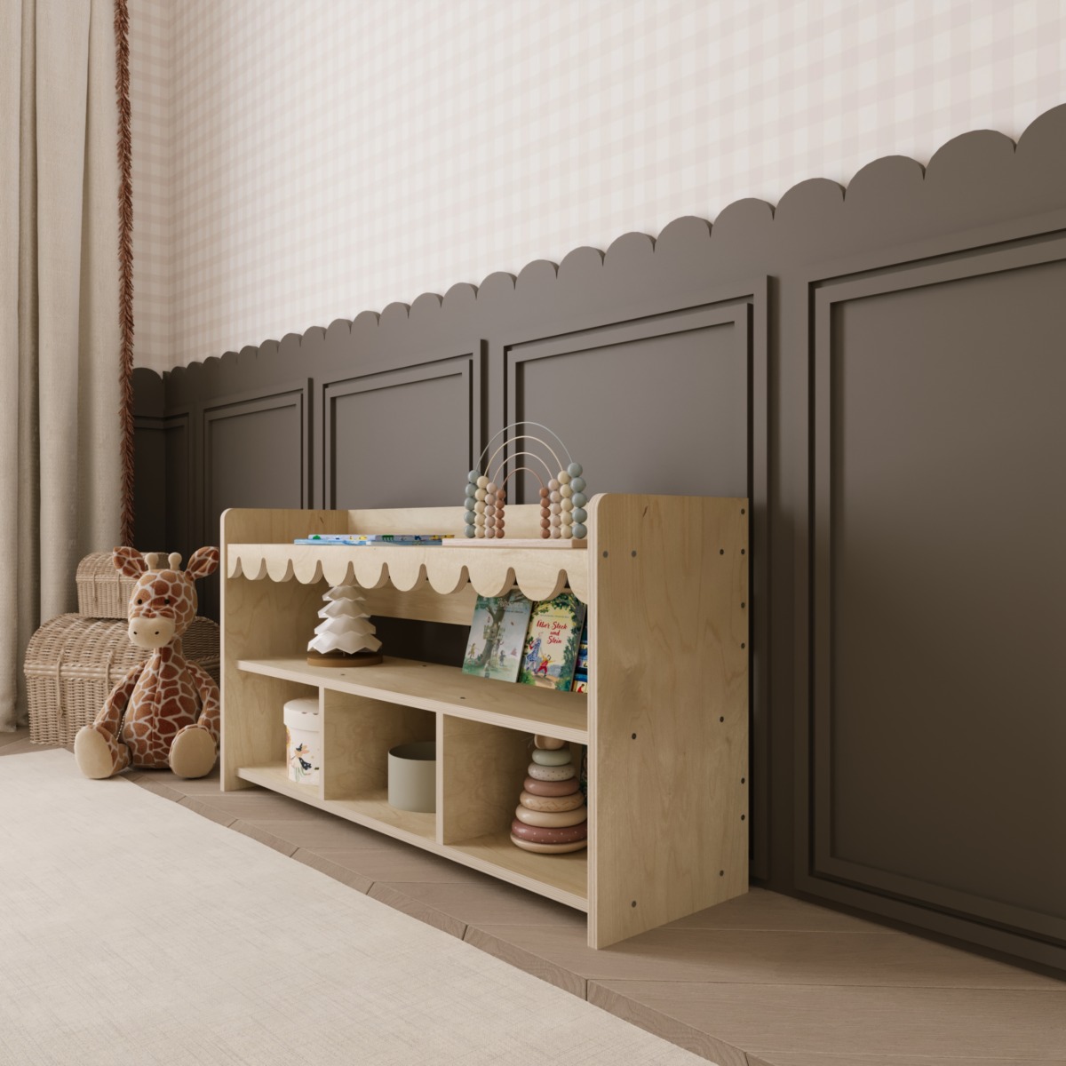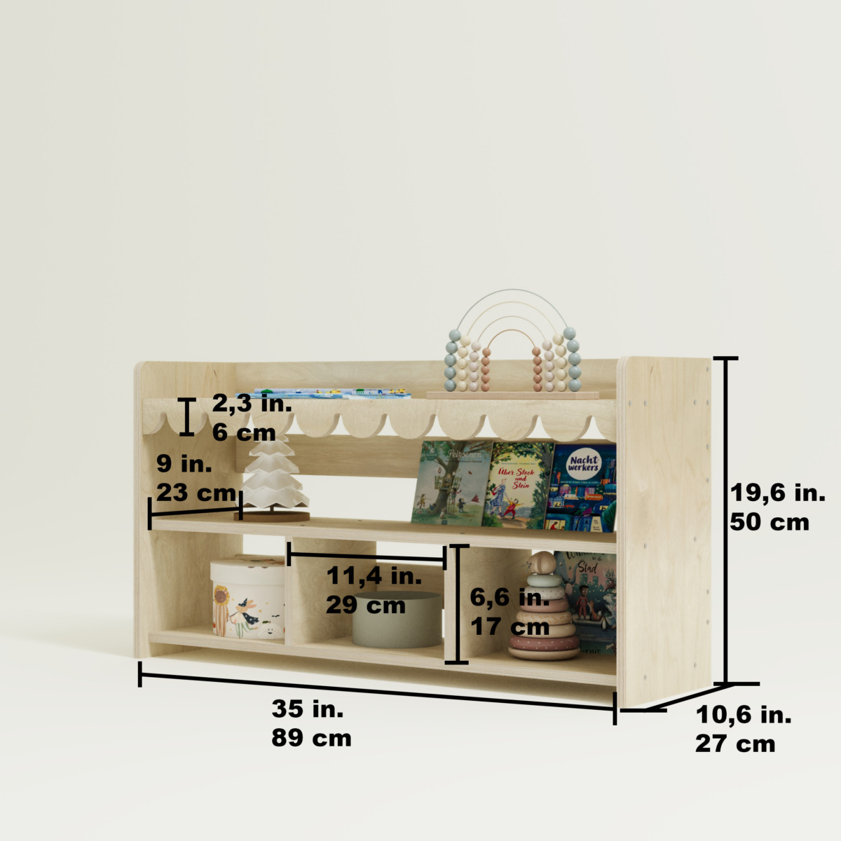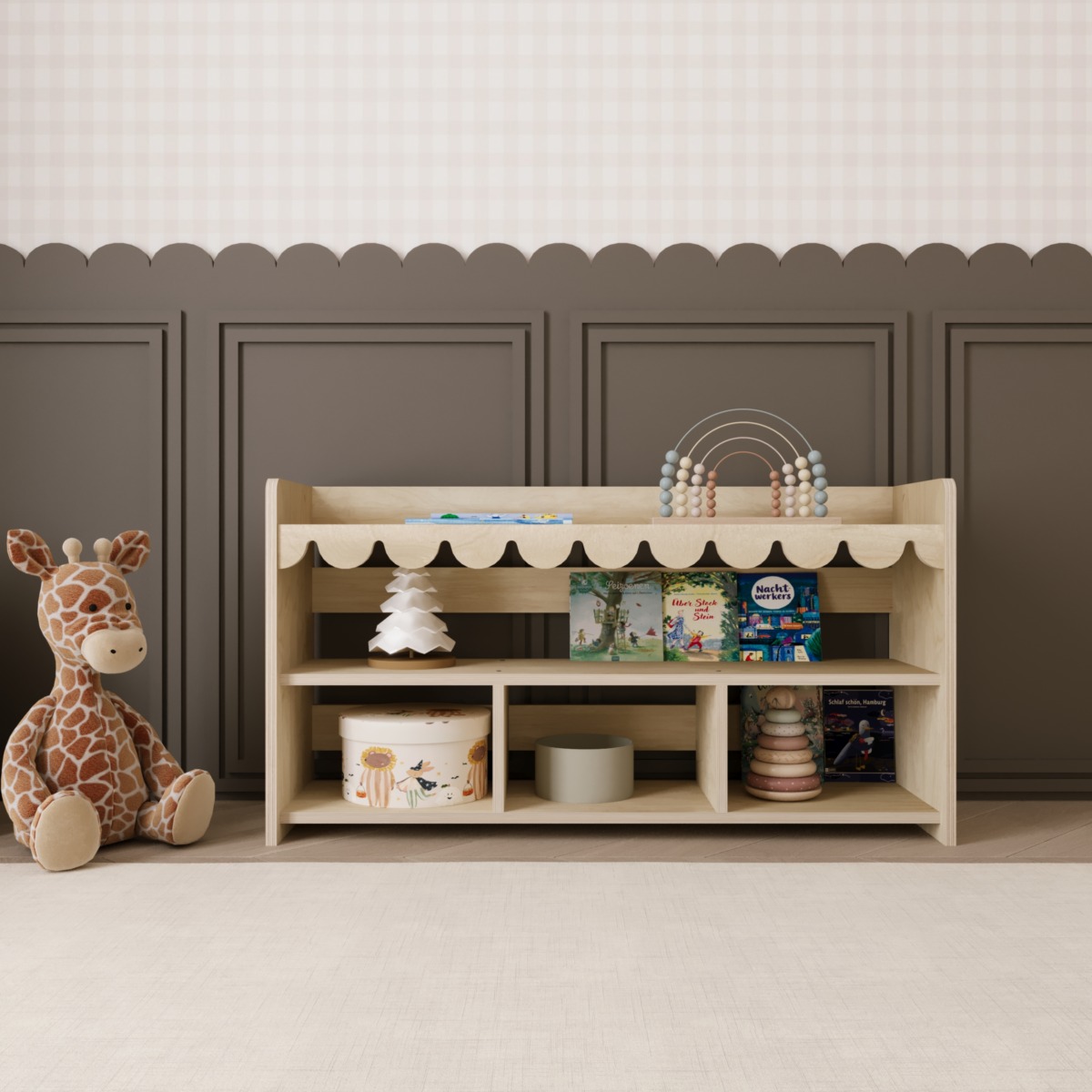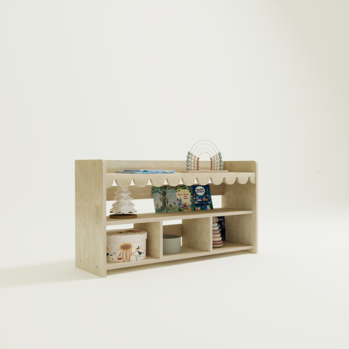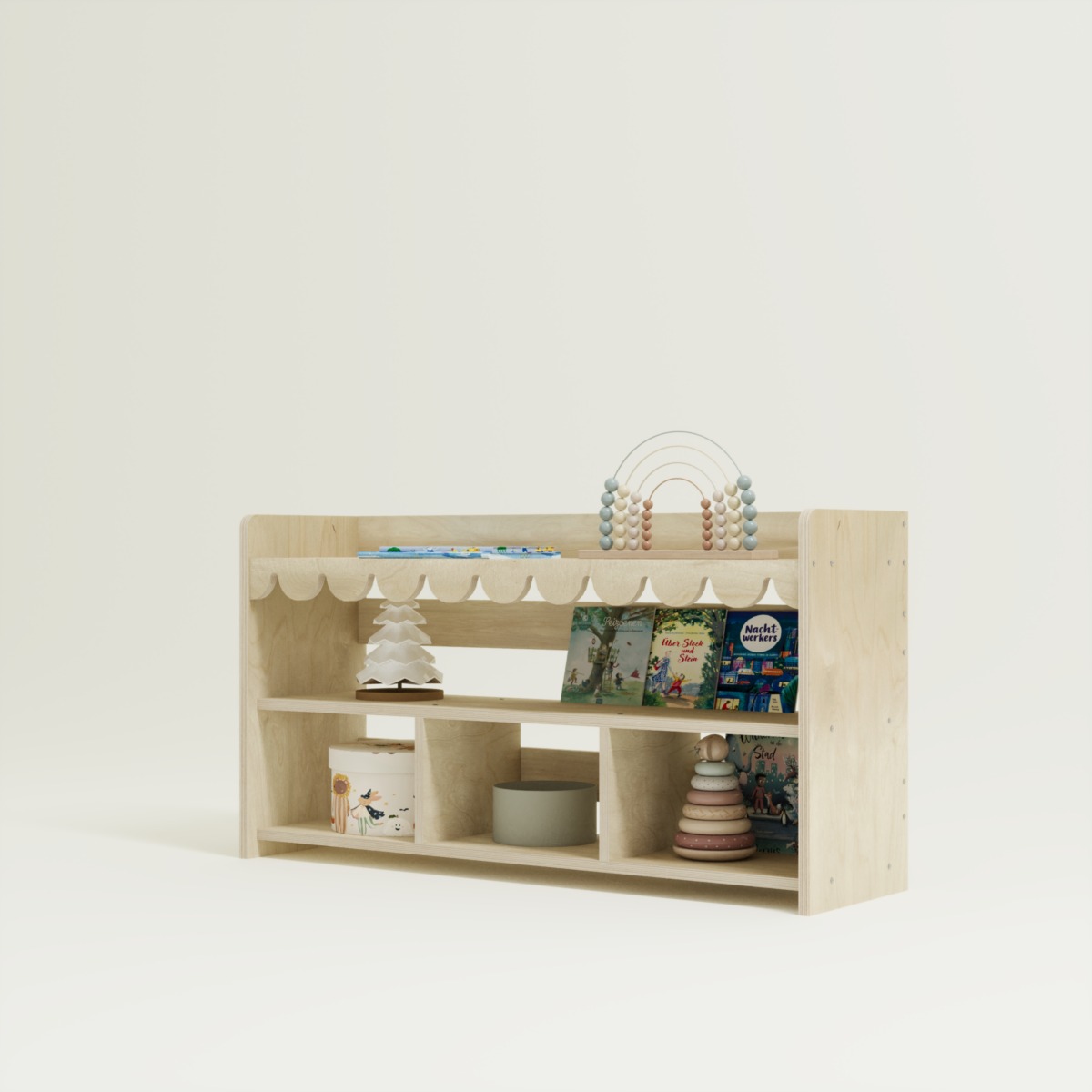 Die unteren Fächer sind ideal für Aufbewahrungskörbe oder größere Spielzeuge, während das obere durchgehende Fach perfekt für Bücher geeignet ist.