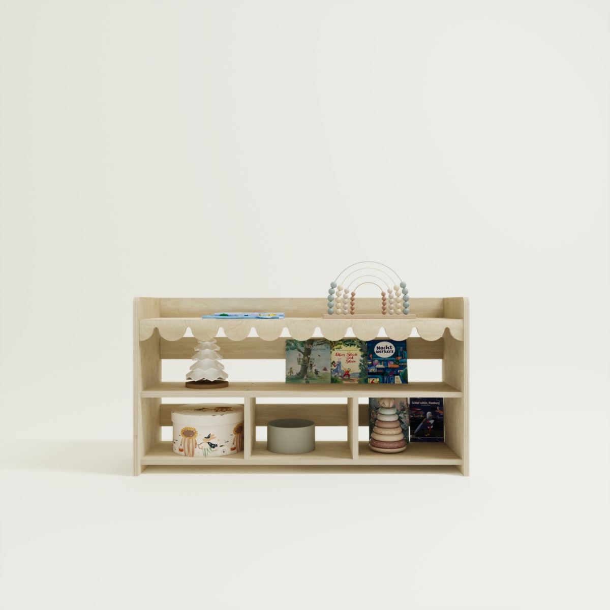 Our Montessori Spielzeugregal – Ondina 3 is expertly crafted from high-quality Birkensperrholz and crafted with intensive handwork. If no customizations are requested, it will be shipped within 5 business days.